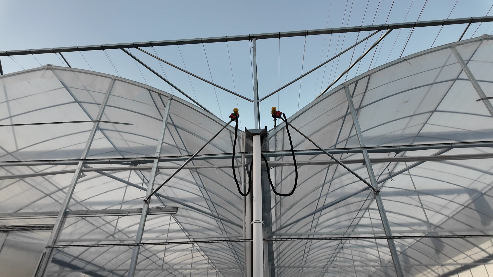 “大棚顶部是从动开合的薄膜取遮阳网,侧面配备轴流风机取防虫网,内部拆有温湿度监测、从动喷雾灌溉系统。所有设备通过太阳能供电,手机APP即可及时查看取调理。”手艺担任人、高级工程师杨建强说。