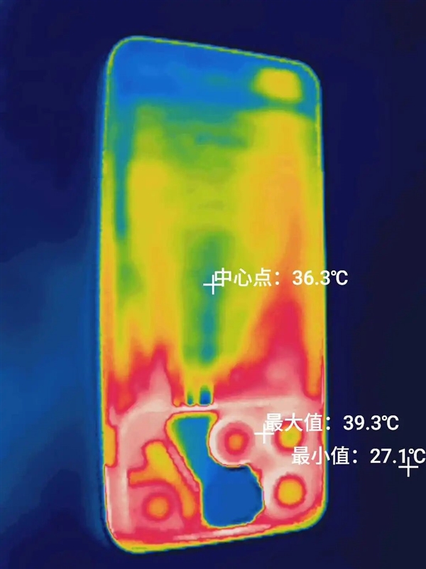 而机身后背最高温度连 40 度都不到,从测温图也能看出来电扇和风道是一蓝色,跟机身其他区域构成明显对比,这电扇有事儿是实上啊。。。