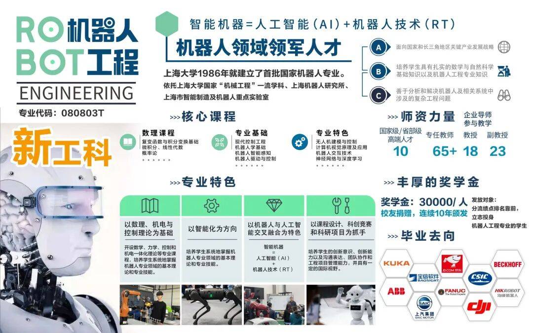 。可是2026年,这个专业正在春考停招。2025年该专业正在秋考本科通俗批中大类招生,登科最低分为559分。机械人工程专业(机电工程取从动化学院)正在本科通俗批中大类招生,属于电气类(理学工学Ⅰ类),登科最低分为556分。注:上大的电子消息类(将来手艺学院)招生中也包含机械人工程专业,其综评批登科最低569分,通俗批登科最低576分。