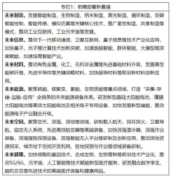 国度层面临将来财产进行了前瞻谋划摆设。《关于鞭策将来立异成长的实施看法》中显示,沉点推进将来制制、将来消息、将来材料、将来能源、将来空间和将来健康六大标的目的财产成长。